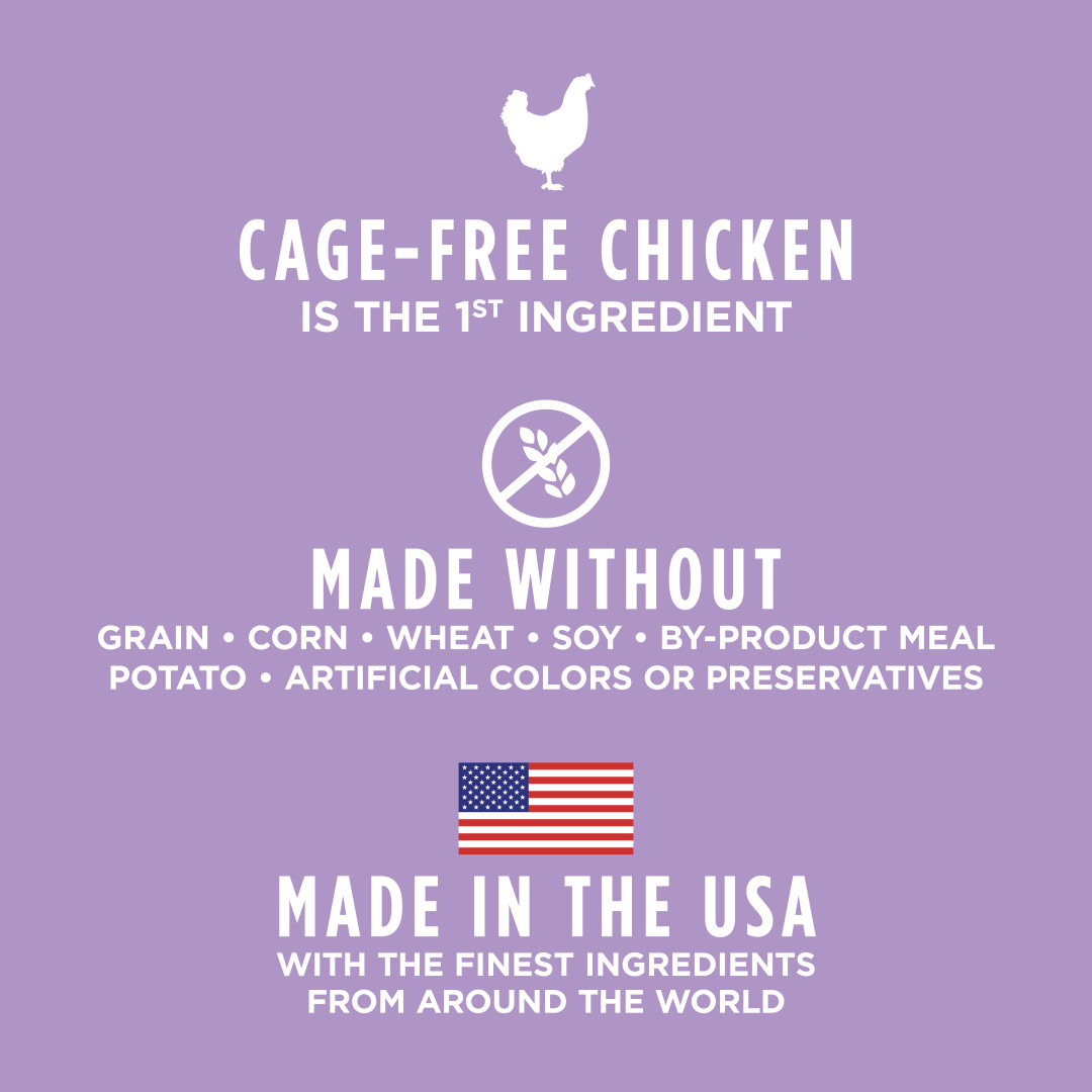- Cage-free chicken is the first ingredient for high animal protein to support the energy needed for growth and play.