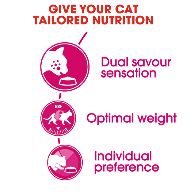 - Dual Savour Sensation Two different kibbles enhance taste variety, appealing to cats attracted by food diversity.